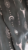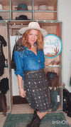 Our exclusive Buffalo Print Flare Skirt seamlessly blends western aesthetics with feminine elegance. Constructed from premium cotton-feel rayon with lightweight cotton lining, this piece showcases a distinctive print complemented by understated reflective metal sequins that provide subtle luminosity. The thoughtfully designed wide waistband and graceful flare create a flattering silhouette, while the side zip and button closure ensures a polished finish. Impeccably crafted for a true-to-size fit that moves with you effortlessly.