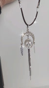 Adorned with an imprinted zamak moon pendant, a charcoal faceted stone, a mother of pearl crescent, and a shimmering slithering tassel, it embodies a celestial goddess aesthetic.