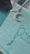 Perfectly designed for moon lovers and those who appreciate the bohemian spirit, this pendant hangs gracefully from a fine sterling silver chain, creating a piece that effortlessly complements any outfit. The twilight-inspired design is not just a piece of jewellery; it is a statement of your connection to the cosmos and the natural elegance it embodies.