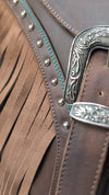 This exquisite brown leather backpack epitomises Boho Buffalo's commitment to craftsmanship and distinctive design. Featuring a striking western buckle, adjustable poppers for customisable fit, and a fully adjustable strap, it seamlessly blends functionality with style. The piece showcases bold rivet detailing and intricate turquoise embroidery, whilst cascading fringing adds authentic western character. Multiple internal and external pockets ensure practical organisation. A limited edition offering that captures the essence of cowgirl luxury.