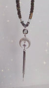 Adorned with a rhodium silver framed charcoal glass stone, zirconia star, a mother of pearl crescent, and a shimmering slithering tassel, it embodies a celestial goddess aesthetic.